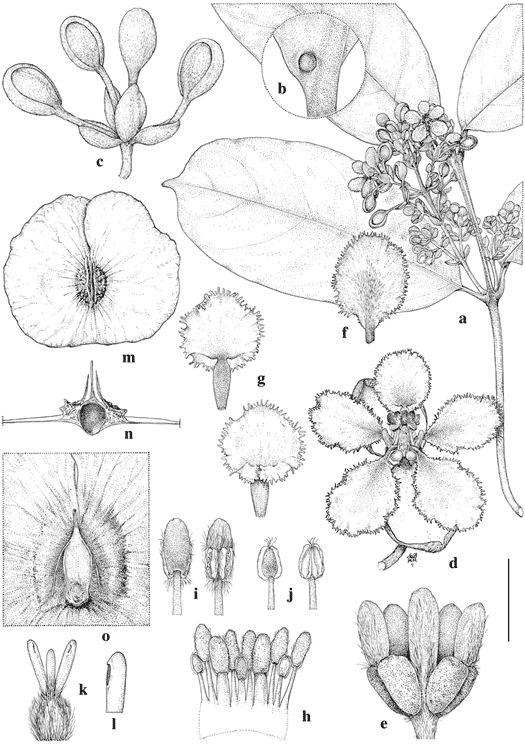 Mezia russellii. a. Flowering branch. b. Abaxial base of lamina with large gland. c. Umbel of flower buds, the bracts and bracteoles not yet full-sized. d. Flower subtended by bracteoles, the posterior petal uppermost. e. Calyx, anterior sepal in center. f. Posterior-lateral petal, abaxial view. g. Posterior petal, adaxial view (left) and abaxial view (below). h. Androecium laid flat, abaxial view, the stamen at right opposite anterior sepal. i. Anthers from stamens opposite sepals, abaxial view (left) and adaxial view (right). j. Anthers from stamens opposite anterior-lateral petals, abaxial view (left) and adaxial view (right). k. Gynoecium, anterior style in center. l. Distal portion of style, lateral view. m. Samara, abaxial view. n. Nut of samara in cross-section, with lateral wing truncated. o. Ventral areole of nut of samara.