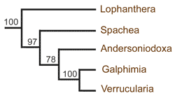 The genera of the Galphimia clade are typically byrsonimoid in their non-vining habits, intrapetiolar stipules, colporate pollen, and (except for Spachea) slender subulate styles. As a clade they enjoy strong molecular support (see phylogenetic tree, Davis & Anderson 2010 [pdf], Davis et al. (2020a) and morphological similarity in several characters, including subentire or only minutely denticulate petals, glabrous or nearly glabrous stamens, similar or subequal anthers in which the connective never exceeds the locules, and a dry fruit breaking apart into unwinged cocci with thin brittle walls. The colpi of the pollen grains are distally bifurcate in some species of this clade, a condition found in no other Malpighiaceae (Lowrie, 1982). The genera all contain laticifers in their stems that produce a white latex (Vega et al., 2002), although the latex is much more abundant and evident in Lophanthera and Spachea than in Andersoniodoxa, Galphimia and Verrucularia. No other genera of Malpighiaceae have been reported to produce latex.