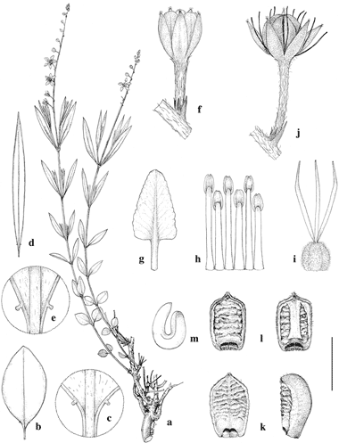 Galphimia angustifolia. a. Flowering habit. b. Wide leaf, adaxial view. c. Base of lamina in b, abaxial view. d. Narrow leaf, abaxial view. e. Base of lamina in d, abaxial view. f. Flower bud, with sessile pedicel subtended by bract and two bracteoles. g. Petal. h. Partial androecium laid out, abaxial view, the stamen at right opposite posterior petal. i. Gynoecium. j. Intact fruit. k. Two cocci, adaxial view (left) and lateral view (right). l. Two cocci, adaxial views. m. Embryo. Scale bar equivalents: a, 4 cm; b, 2 cm; c, 2 mm; d, 2 cm; e, 2 mm; f, 4 mm; g, 2.7 mm; h, i, 2 mm; j, 4 mm; k, l, 2.7 mm; m, 2 mm. Based on: a, Pringle 1940, GH; b, c, Reverchon 1505, NY; d, e, Correll 29602, LL; f, Miller et al. 5665, MICH; g–i, McGregor 16749, US; j, l, m, Daniel 6895, CAS; k, Butterwick & Lott 3728, TEX. Drawn by Karin Douthit. First published in Contr. Univ. Michigan Herb. 25: 39. 2007; reproduced with permission of the author.