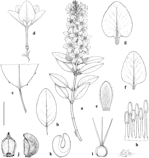 Galphimia calliantha. a. Flowering branch. b. Leaf, abaxial view. c. Base of leaf, adaxial view; note glands on margin. d. Flower, lateral view. e. Sepal, abaxial view. f. Lateral petal, adaxial view. g. Posterior petal, adaxial view. h. Partial androecium laid out, abaxial view, stamen at left opposite posterior petal. i. Gynoecium. j. Cocci, adaxial view (left) and lateral view (right). k. Embryo. Scale bar equivalents: a, b, 4 cm; c, 8 mm; d, 1.3 cm; e, 4 mm; f, g, 8 mm; h–j, 4 mm; k, 2 mm. Based on: a, d–k, Rzedowski 18095, MICH; b, c, Hinton 9848, MO. Drawn by Karin Douthit. First published in Contr. Univ. Michigan Herb. 25: 72. 2007; reproduced with permission of the author.