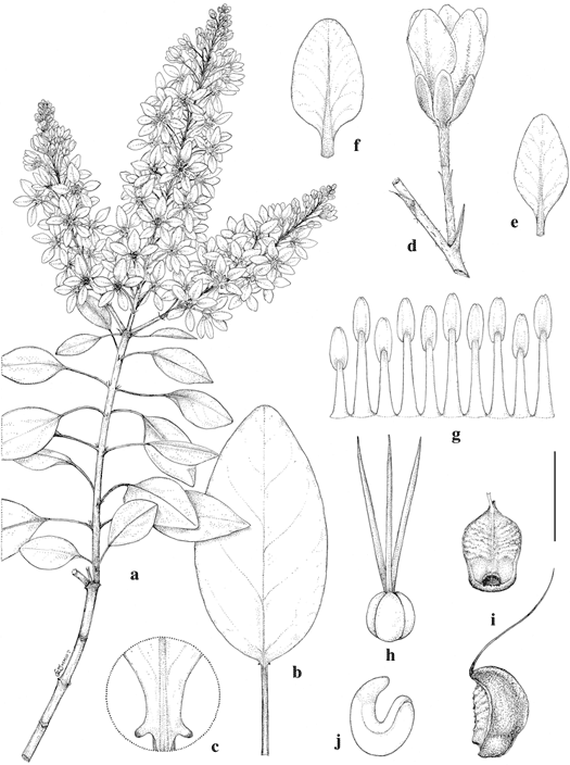 Galphimia floribunda. a. Flowering branch. b. Detached large leaf. c. Base of lamina. d. Opening flower, borne on pedicel and peduncle, with portion of inflorescence axis. e. Lateral petal. f. Posterior petal. g. Androecium laid out, abaxial view, the stamen at left opposite posterior petal. h. Gynoecium. i. Cocci, adaxial view (above) and lateral view (below). j. Embryo. Drawn by Karin Douthit. Scale bar equivalents: a, b, 4 cm; c, e, f, 8 mm; d, 5.7 mm; g, i, 4 mm; h, j, 2.7 mm. Based on: a, i, j, Palmer 284 in 1890, US; b, c, Rose 13095, US; d–h, Reina G. 97-338, MICH. Drawn by Karin Douthit. First published in Contr. Univ. Michigan Herb. 25: 78. 2007; reproduced with permission of the author.