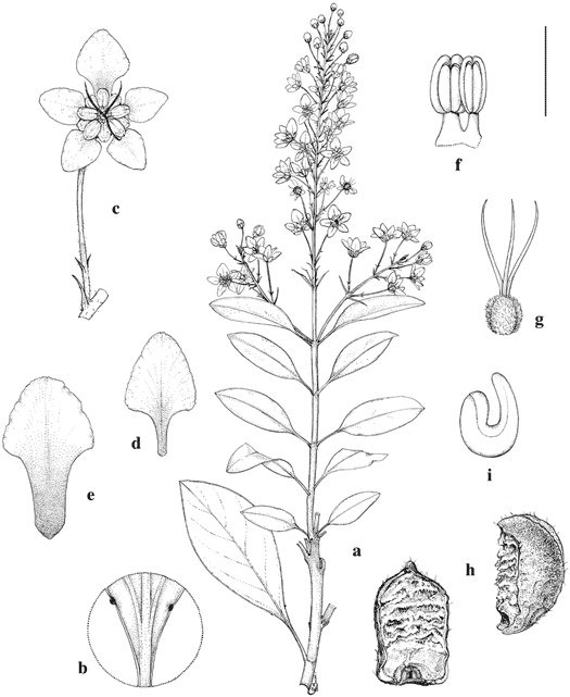 Galphimia mexiae. a. Flowering branch. b. Base of lamina, showing marginal glands. c. Flower with posterior petal uppermost, borne on pedicel and peduncle, with portion of inflorescence axis. d. Lateral petal. e. Posterior petal. f. Stamens, adaxial view, opposite posterior petal (left) and posterior-lateral sepal (right). g. Gynoecium. h. Cocci, lateral view (right) and adaxial view (left). i. Embryo. Scale bar equivalents: a, 4 cm; b, 8 mm; c, 1 cm; d, e, 5 mm; f–h, 4 mm; i, 2.7 mm. Based on: a–c, Anderson & Anderson 6122, MICH; d–g, Nelson 4060, US; h, i, Almeda 2543, MICH. Drawn by Karin Douthit. First published in Syst. Bot. 28: 718. 2003; reproduced with permission of the author.