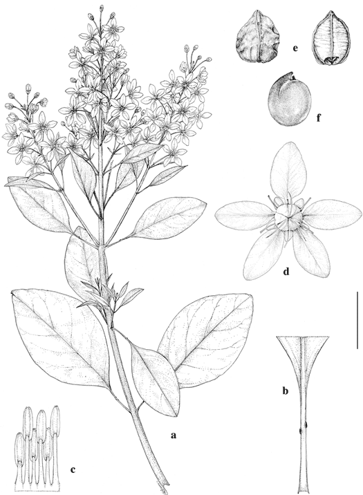 Scale bar equivalents: a, 4 cm; b, 1.3 cm; c, 4 mm; d, 1 cm; e, 4 mm; f, 2.7 mm. Based on: a–c, Machuca 5023, MICH; d, McVaugh 14237, MICH; e, f, González T. 9, MICH. Drawn by Karin Douthit. First published in Contr. Univ. Michigan Herb. 25: 68. 2007; reproduced with permission of the author.
