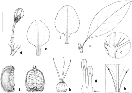 Galphimia radialis. a. Leaf. b. Base of lamina, showing marginal glands. c. Node, showing long stipules. d. Flower bud, borne on pedicel and peduncle, with portion of inflorescence axis. e. Lateral petal. f. Posterior petal. g. Stamens, abaxial view, opposite posterior petal (right) and posterior-lateral sepal (left). h. Gynoecium. i. Cocci, lateral view (left) and adaxial view (right). Scale bar equivalents: a, 4 cm; b, c, 1 cm; d, 1.3 cm; e, f, 5 mm; g–i, 4 mm. Based on: a, Estrada R. 119, IEB; b–d, Fonseca 1001, MEXU; e–h, Tenorio L. 1471, MICH; i, Paray 2014, ENCB. Drawn by Karin Douthit. First published in Syst. Bot. 28: 719. 2003; reproduced with permission of the author.