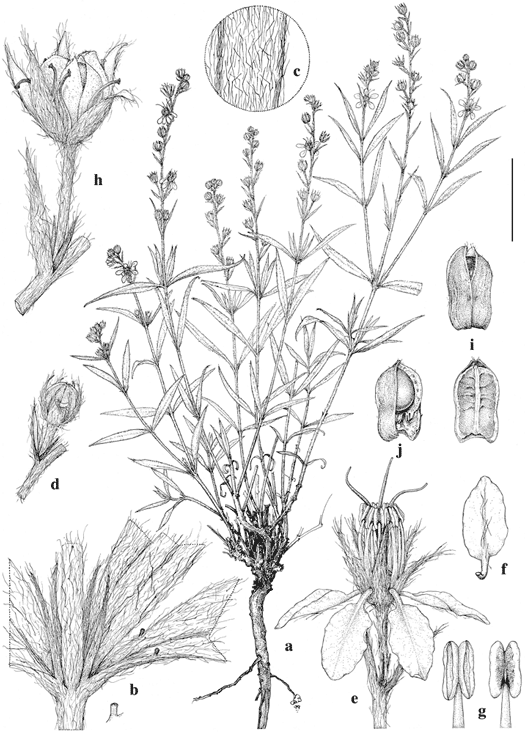 Scale bar equivalents: a, 4 cm; b, 4 mm (2 mm); c, 4 mm; d, 5.7 mm; e, f, 5 mm; g, 2 mm; h–j, 4 mm. Based on: a–d, White 3574, GH; e–j, Wiggins 7471, DS. Drawn by Karin Douthit. First published in Contr. Univ. Michigan Herb. 25: 43. 2007; reproduced with permission of the author.