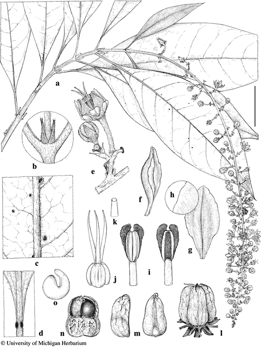 Scale bar equivalents: a, 4 cm; b, 1.3 cm; c–e, 8 mm; f, g, 4 mm; h, 0.8 mm; i, j, 2.7 mm; k, 0.4 mm; l–n, 8 mm; o, 4 mm. Based on: a, b, d, Maguire et al. 36604, MICH; c, Prance 30113, MICH; e, Liesner 9002, MICH; f–k, Level L-25, MICH; l–o, Henderson & Guedes 1600, MICH. Drawn by Karin Douthit. © University of Michigan Herbarium.