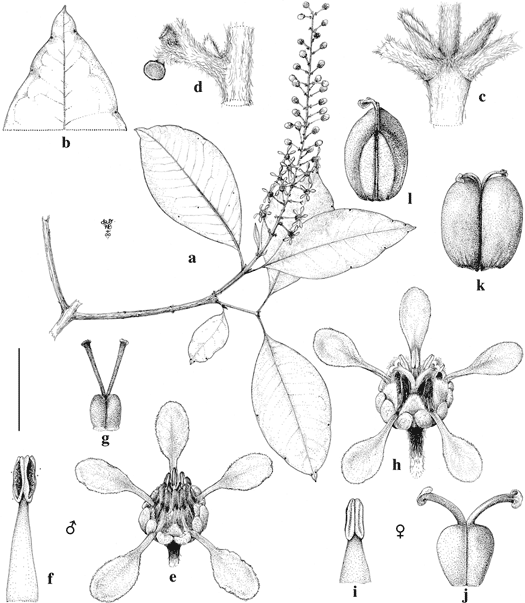 Scale bar equivalents: a, 4 cm; b, 2 cm, c, d, 4 mm; e, 5 mm; f, 2 mm; g, 2.7 mm; h, 5 mm; i, 2 mm; j, 2.7 mm; k, l, 4 mm. Based on: a–d, h–j, Aristeguieta 5297, VEN; e–g, Pires et al. 14334, MICH; k, l, Steyermark 87154, MICH. First published in Mem. New York Bot. Gard. 32: 44. 1981; modified and reproduced with permission of the author.