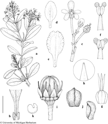 Verrucularia glaucophylla. a. Flowering branch. b. Petiole and stipules, adaxial view. c. Three-flowered cincinnus. d. Lateral petal, abaxial view. e. Posterior petal, abaxial view. f. Anthers, adaxial view (above) and abaxial view (below). g. Gynoecium. h. Apex of style. i. Fruit. j. Cocci, abaxial view (left) and lateral view (right). k. Embryo. Scale bar equivalents: a, 4 cm; b, 4 mm; c, 1 cm; d, e, 4 mm; f, g, 1.3 mm; h, 0.4 mm; i–k, 4 mm. Based on: a, i–k, Carvalho et al. 1036, MICH; b, Ganev 1903, MICH; c–h, Harley et al. 25901, MICH. Drawn by Karin Douthit. © University of Michigan Herbarium.