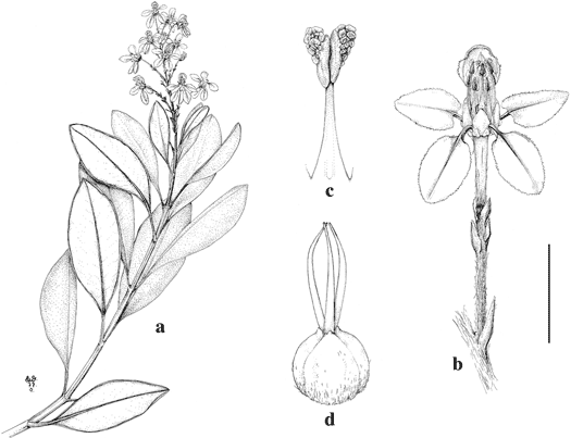 Verrucularia piresii. a. Flowering branch. b. Flower, posterior petal uppermost. c. Stamen, adaxial view. d. Gynoecium. Scale bar equivalents: a, 4 cm; b, 8 mm; c, 2 mm; d, 2.7 mm. Based on Pires 15040, MICH. Drawn by Karin Douthit. First published in Mem. New York Bot. Gard. 32: 46. 1981; modified and reproduced with permission of the author.