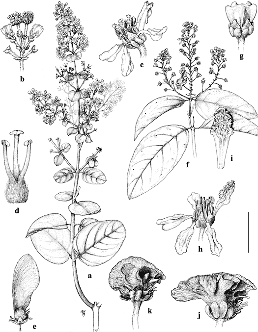 f–k, H. complicata. f. Branch with flowers and fruits. g. Flower bud. h. Flower, posterior petal at upper right. i. Posterior petal, showing papillose adaxial surface. j, k. Fruits, each with only one mericarp developing. Scale bar equivalents: a, 4 cm; b, 8 mm; c, 5.7 mm; d, 2 mm; e, 1.3 cm; f, 4 cm; g, 4 mm; h, 5.7 mm; i, 4 mm; j, k, 5 mm. Based on: a–d,
