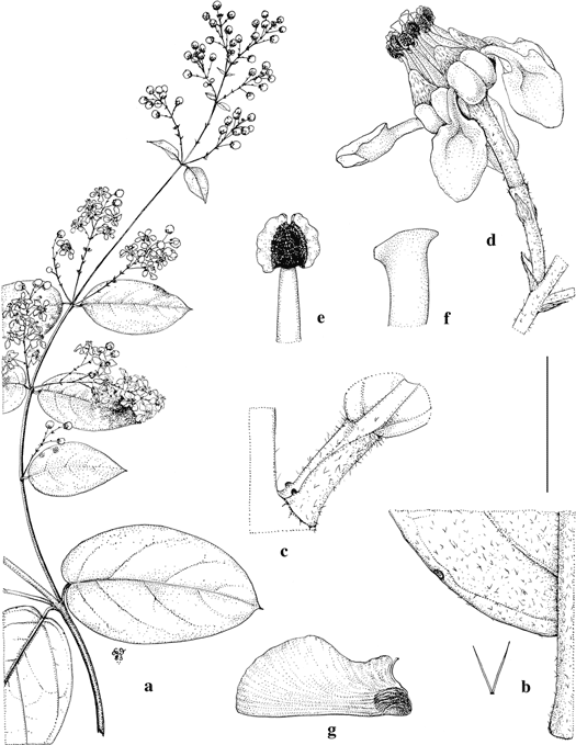 Scale bar equivalents: a, 4 cm; b, 5 mm (ca. 0.75 mm); c, d, 4 mm; e, 2 mm; f, 1 mm; g, 2 cm.—Based on: a–f, Anderson et al. 37119, MICH; g, Anderson et al. 37118, MICH. Drawn by Karin Douthit. First published in Contr. Univ. Michigan Herb. 16: 76. 1987; reproduced with permission of the author.