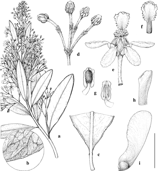 Heteropterys alternifolia. a. Flowering branch. b. Enlargement of adaxial leaf surface. c. Base of leaf, abaxial view. d. Umbel of four flower buds. e. Flower, posterior petal uppermost. f. Posterior petal. g. Anthers, abaxial view (left) and adaxial view (right). h. Distal portion of style. i. Samara.