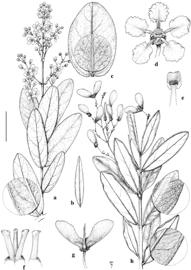 Heteropterys. a–g, H. atabapensis. a. Flowering branch, with enlargement of abaxial leaf surface. b. Narrow leaf. c. Broad leaf, with enlargement of adaxial surface. d. Flower, posterior petal uppermost. e. Anther, abaxial view. f. Gynoecium (left) and lateral view of style (right). g. Fruit. h, H. oblongifolia, fruiting branch, with enlargements of abaxial leaf surface (below) and adaxial leaf surface (above). Scale bar equivalents: a–c, 4 cm; d, 8 mm; e, 1.6 mm; f, 2.7 mm; g, 2 cm; h, 4 cm.—Based on: a, Wurdack & Adderley 42778, NY; b, Maguire et al. 36282, MICH; c, g, Maguire & Wurdack 35575, NY; d–f, Wurdack & Adderley 43765, NY; h, Maguire et al. 37585, NY. Drawn by Karin Douthit. First published in Mem. New York Bot. Gard. 32: 199. 1981; reproduced with permission of the author.