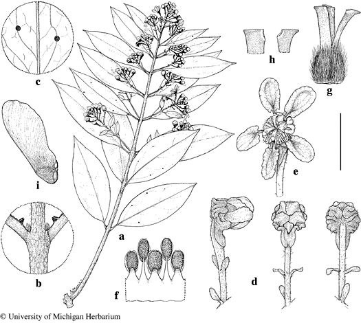 Heteropterys bicolor. a. Flowering branch. b. Node to show epipetiolar stipules. c. Abaxial surface of lamina to show glands. d. Flower buds with decurrent calyx glands adjacent to innermost petal, three views. e. Flower, innermost petal pointed downward. f. Portion of androecium laid out, abaxial view, stamen in center opposite innermost petal. g. Gynoecium, lateral view, anterior style to right. h. Distal portions of posterior style (left) and anterior style (right). i. Samara. Scale bar equivalents: a, 4 cm; b, 4 mm; c, 8 mm; d, e, 5.7 mm; f, 2.7 mm; g, 2 mm; h, 1.3 mm; i, 2 cm. Based on: a–h, Silva et al. 2215, MICH; i, Hatschbach 23480, MICH. Drawn by Karin Douthit. © University of Michigan Herbarium.
