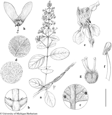 Heteropterys brachiata. a. Flowering branch. b. Node to show epipetiolar stipules. c. Abaxial base of lamina to show glands. d. Leaf surfaces enlarged, abaxial (above) and adaxial (below). e. Flower, side view, posterior petal at upper right. f. Stamen, side view. g. Gynoecium, anterior style to right. h. Fruit with two samaras developed.  Scale bar equivalents: a, 4 cm; b–d, 4 mm; e, 5 mm; f, 2 mm; g, 2.7 mm; h, 2 cm.—Based on: a–g, Anderson & Laskowski 3847, MICH; h, McVaugh 22006, MICH. Drawn by Karin Douthit. © University of Michigan Herbarium.