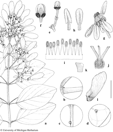 Heteropterys cotinifolia. a. Fruiting branch. b. Epipetiolar stipule. c. Gland on petiole. d. Gland on abaxial leaf surface. e. Flower bud borne on pedicel and peduncle. f. Flower bud enlarged to show keeled petals. g. Flower, lateral view, posterior petal uppermost. h. Petals, abaxial views, lateral petal (right) and posterior petal (left). i. Androecium laid out, abaxial view, stamen second from left opposite posterior petal. j. Gynoecium, anterior style in center. k. Distal portion of style, lateral view. l. Samara. Scale bar equivalents: a, 4 cm; b, 4 mm; c–e, 8 mm; f, g, 5.7 mm; h, 5 mm; i, 4 mm; j, 2.7 mm; k, 1 mm; l, 2 cm. Based on: a–d, l, Anderson & Laskowski 4330, MICH; e–k, Flores-Franco et al. 2692, MICH. Drawn by Karin Douthit. © University of Michigan Herbarium.