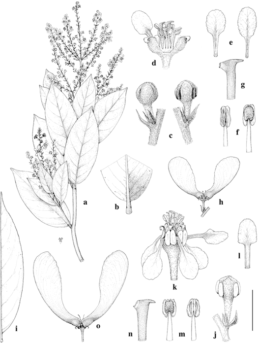 Heteropterys. a–h, H. hatschbachii. a. Flowering branch. b. Base of leaf, abaxial view, to show glands on petiole, tiny glands on lamina, and fine reticulum. c. Flower buds, with and without glands on lateral sepals. d. Flower, lateral view, with all petals removed except posterior and with one lateral sepal cut away. e. Petals, abaxial view to show hairs, posterior petal (left) and lateral petal (right). f. Anthers, adaxial view (left) and abaxial view (right). g. Distal portion of style. h. Fruit with two samaras developed. i–o, H. mathewsana. i. Leaf, abaxial view. j. Flower bud. k. Flower, lateral view with posterior petal to right. l. Posterior petal, abaxial view. m. Anthers, abaxial view (left) and adaxial view (right). n. Distal portion of style. o. Fruit with two samaras developed. Scale bar equivalents: a, i, 4 cm; b, 1.3 cm; c–e, j–l, 4 mm; f, m, 2 mm; g, n, 1 mm; h, o, 2 cm.—Based on: a–h, Anderson 11257, MICH, except gland-bearing bud in c, Hatschbach 37651, MICH; i–n, Ribeiro & Pinheiro 1189, MICH; o, Ribeiro & Pinheiro 1188, MICH. Drawn by Karin Douthit. First published in Contr. Univ. Michigan Herb. 22: 13. 1999; reproduced with permission of the author.