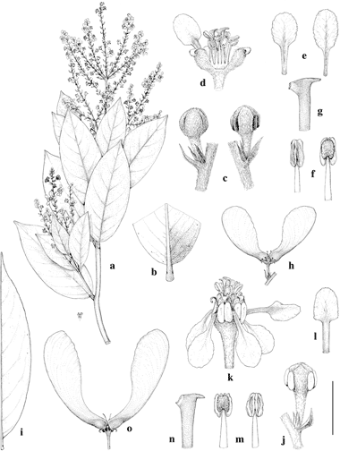 i–o, H. mathewsana. i. Leaf, abaxial view. j. Flower bud. k. Flower, lateral view with posterior petal to right. l. Posterior petal, abaxial view. m. Anthers, abaxial view (left) and adaxial view (right). n. Distal portion of style. o. Fruit with two samaras developed.