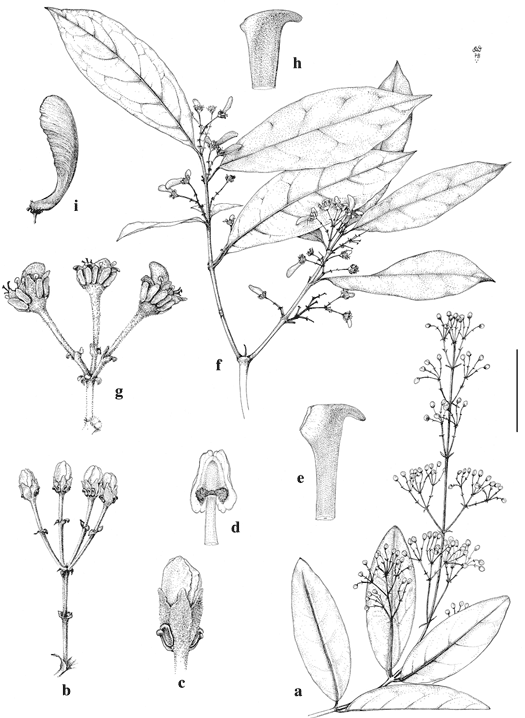 f–i, H. oligantha. f. Branch with immature fruits. g. Umbel of three old flowers with developing samaras. h. Distal portion of style. i. Samara.