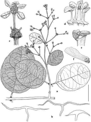 Heteropterys neblinensis. a. Flowering branch. b. Hairs, left to right from adaxial surface of lamina, abaxial surface, and inflorescence axis. c. Flower in umbel, posterior petal at upper left. d. Partial androecium, the stamen at left opposite posterior petal. e. Apex of style. f. Samara. Scale bar equivalents: a, 4 cm; b, 0.3 mm; c, 7.9 mm; d, 2.6 mm; e, 0.9 mm; f, 2.3  cm.—Based on: a–e, Maguire et al. 42111, NY; f, Maguire et al. 37207, MICH. Drawn  by Annette Seidenschnur Mahler. First published in Mem. New York Bot. Gard. 32: 177. 1981; reproduced with permission of the author.