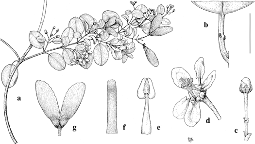 Heteropterys purpurea. a. Branch with flowers and fruits. b. Petiole with glands. c. Flower bud, borne on pedicel and peduncle. d. Flower, posterior petal uppermost. e. Stamen, abaxial view. f. Distal portion of style. g. Fruit with only two of the three samaras developed. Scale bar equivalents: a, 4 cm; b, c, 8 mm; d, 2 mm; e, 1 mm; f, 2 cm. Drawn by Karin Douthit. First published in Fl. Lesser Antilles 4: 631. 1988; reproduced with permission of the author.