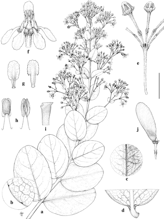Heteropterys sincorensis. a. Flowering branch. b. Enlargement of abaxial surface of lamina. c. Enlargement of adaxial surface of lamina. d. Base of leaf, abaxial view. e. Umbel of flower buds. f. Flower, posterior petal uppermost. g. Anterior-lateral petal (left) and posterior petal (right), abaxial views. h. Stamens, abaxial view (left) and adaxial view (right). i. Apex of style. j. Samara borne on receptacle.