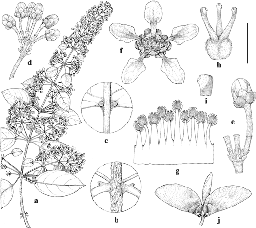 Scale bar equivalents: a, 4 cm; b, 4 mm; c, d, 8 mm; e, 4 mm; f, 3.3 mm; g, h, 2 mm; i, 0.8 mm; j, 1.3 cm.—Based on: a–i, Särkinen 3063, MICH; j, Hughes 3139, MICH. Drawn by Karin Douthit. First published by W. R. Anderson in Acta Botanica Mexicana 109: 25. 2014.