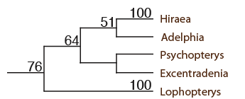 The Hiraea clade enjoys only moderate support from molecular evidence—see the phylogenetic tree above, with bootstrap values above the branches, which is from Davis & Anderson (2010 [pdf]). The most important respect in which the five genera are alike is that their samaras all have the lateral wings dominant and the dorsal wing small or absent, but similar fruits are produced in other clades of Malpighiaceae, so we cannot make too much of that similarity. Support for the branches within the clade is weak, suggesting that the relationships among these genera will probably change in future trees. On the basis of their morphology one can say with some confidence that Hiraea, Excentradenia, and Adelphia are rather closely related. Psychopterys, on the other hand, resembles the other genera only in its samaras and marginal leaf glands, and Lophopterys is also quite distinct in most characters. See the discussions under the genera.