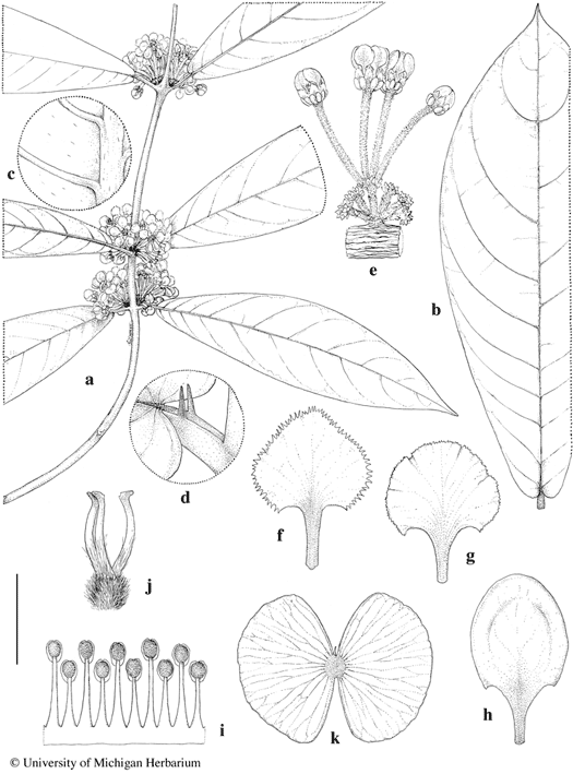 Scale bar equivalents: a, b, 4 cm; c, 4 mm; d, 8 mm; e, 1.3 cm; f–j, 4 mm; k, 2.7 cm. Based on: a, f–j, Maas et al. 7417, NY; b, Oldeman B-2995, MICH; c, d, Granville B-4662, P; e, Sandwith 1185, K; k, Lanjouw 989, P. Drawn by Karin Douthit. © University of Michigan Herbarium.