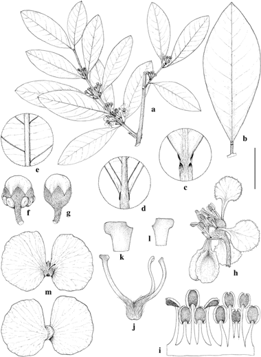 Hiraea andersonii. a. Flowering branch. b. Large leaf, adaxial view. c. Distal portion of petiole and base of lamina, adaxial view. d. Distal portion of petiole and base of lamina, abaxial view. e. Midrib and adjacent veins, mid-lamina, abaxial view. f. Flower bud with most sepals biglandular. g. Flower bud with all sepals eglandular. h. Flower, lateral view, posterior petal uppermost. i. Androecium laid out, abaxial view, the stamen third from right opposite posterior petal. j. Gynoecium, anterior style at left. k. Terminal portion of anterior style. l. Terminal portion of posterior style. m. Samaras, adaxial view (above) and abaxial view (below). Scale bar equivalents: a, b, 4 cm; c, d, 5 mm; e, 8 mm; f, g, 4 mm; h, 5.7 mm; i, j, 2.7 mm; k, l, 1 mm; m, 2 cm. Based on: a, c–e, g–l, Klug 737, US; b, Gentry & Jaramillo 22301, MICH; f, Rimachi Y. 8435, MO; m, Rimachi Y. 4811, MO. Drawn by Karin Douthit. First published in Mem. New York Bot. Gard. 108: 206. 2013; reproduced with permission of the author.