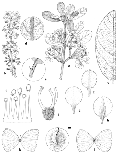 Hiraea barclayana. a. Flowering branch. b. Detached large leaf, adaxial view. c. Node to show epipetiolar stipules. d. Detached large leaf, abaxial view, with enlargement to show marginal glands. e. Enlargement of abaxial leaf surface to show non-parallel cross-veins. f. Base of umbel. g. Flower, posterior petal uppermost. h. Flower with petals and some anthers removed, anterior style to right. i. Anther. j. Samaras, abaxial view (above) and adaxial view (below). Scale bar equivalents: a, b, 4 cm; c, 8 mm; d, 4 cm (4 mm); e, 1.6 cm; f, 5.7 mm; g, 8 mm; h, 4 mm; i, 1.3 mm; j, 2.7 cm. Based on: a–c, f–i, McVaugh 15228, MICH; d–e, j, McVaugh 15257, MICH. Drawn by Karin Douthit. First published in Blumea 61: 128. 2016; reproduced with permission of the author.