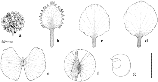 Hiraea cephalotes. a. Inflorescence. b. Posterior petal. c. Posterior-lateral petal. d. Anterior-lateral petal. e. Samara, abaxial view. f. Detail showing dorsal wing of samara. g. Embryo. Scale bar equivalents: a, 4 cm; b–d, 4 mm; e, 2.7 cm; f, 1 cm; g, 8 mm. Based on: a, Toro 923, NY; b–d, Barkley 18C655, US; e–g, Clark 190, MICH. Drawn by Karin Douthit. First published in Edinburgh J. Bot. 70: 421. 2013; reproduced with permission of the author.