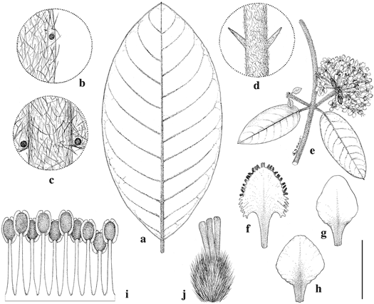 Hiraea escobariae. a. Large leaf, abaxial view. b. Marginal leaf gland, abaxial view. c. Glands at base of lamina, abaxial view. d. Portion of petiole with a pair of stipules, adaxial view. e. Portion of stem with inflorescence. f. Posterior petal. g. Posterior-lateral petal. h. Anterior-lateral petal. i. Androecium laid out, abaxial view, second stamen from right opposite posterior petal. j. Gynoecium, anterior style at left. Scale bar equivalents: a, 4 cm; b, c, 2 mm; d, 8 mm; e, 4 cm; f–h, 4 mm; i, j, 2.7 mm. Based on: a, Fonnegra et al. 4725, MICH; b–j, Albert de Escobar et al. 6331, MICH. Drawn by Karin Douthit. First published in Edinburgh J. Bot. 70: 425. 2013; reproduced with permission of the author.