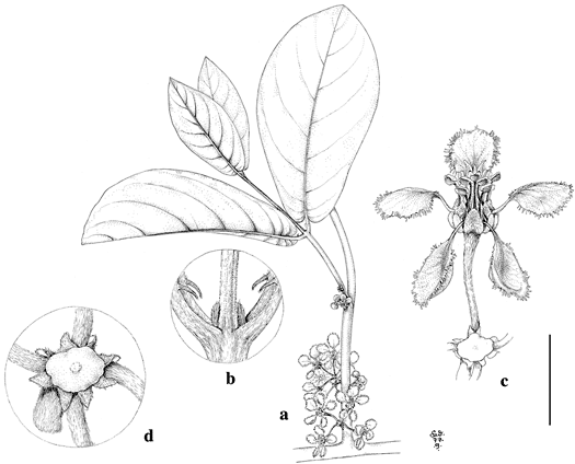 Hiraea fimbriata. a. Flowering branch. b. Node with epipetiolar stipules. c. Flower, posterior petal uppermost. d. Glandular cushion in center of umbel. Scale bar equivalents: a, 4 cm; b, 6.7 mm; c, 8 mm; d, 4 mm. Based on Wurdack & Monachino 39770, MICH. Drawn by Karin Douthit. First published in Mem. New York Bot. Gard. 32: 241. 1981; reproduced with permission of the author.