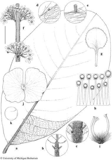 Hiraea grandifolia. a. Large leaf, abaxial view. b. Distal portion of petiole with stipules and base of lamina, adaxial view. c. Distal portion of petiole with a pair of glands and base of lamina, abaxial view. d, e. Marginal leaf glands, abaxial view. f. Portion of stem with axillary inflorescences, the leaves abscissed. g. Posterior petal. h. Androecium laid out, abaxial view, the stamen fifth from left opposite posterior petal. i. Gynoecium, anterior style at right. j. Samara, abaxial view. k. Embryo. Scale bar equivalents: a, 4 cm; b, 2 cm; c, 1 cm; d, e, 2 mm; f, 4 cm; g, 4 mm; h, 2.7 mm; i, 4 mm; j, 2 cm; k, 4 mm. Based on: a–i, Allen 6709, US; j, k, Allen 5855, UC. Drawn by Karin Douthit. © University of Michigan Herbarium.