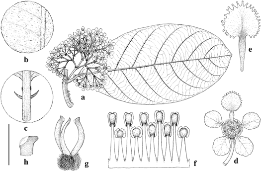 Hiraea kariniana. a. Portion of flowering branch with large leaf, abaxial view. b. Detail of abaxial leaf surface, showing pubescence. c. Distal portion of petiole and base of lamina, abaxial view, showing a lateral pair of glands and a pair of stipules. d. Flower, posterior petal uppermost. e. Posterior petal. f. Androecium laid out, abaxial view, the stamen second from left opposite posterior petal. g. Gynoecium, anterior style at right. h. Apex of anterior style. Scale bar equivalents: a, 4 cm; b, 4 mm; c, 1.3 cm; d, 8 mm; e, 4 mm; f, g, 2.7 mm; h, 0.8 mm. Based on Neill et al. 13653, MICH. Drawn by Karin Douthit. First published in New York Bot. Gard. 108: 213. 2013; reproduced with permission of the author.