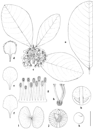 Hiraea klugii. a. Large leaf, abaxial view. b. Base of lamina and apex of petiole with a pair of glands and a pair of stipules, abaxial view. c. Stem apex with three leaves and inflorescences. d. Posterior petal. e. Posterior-lateral petal. f. Anterior-lateral petal. g. Androecium, abaxial view, the stamen third from left opposite posterior petal. h. Gynoecium, anterior style at left. i. Samara, abaxial view. j. Detail of samara showing dorsal wing. k. Embryo. Scale bar equivalents: a, 4 cm; b, 8 mm; c, 4 cm; d–f, 5.7 mm; g, h, 2.7 mm; i, 2.7 cm; j, 8 mm; k, 5.7 mm. Based on: a, b, d–h, Brandbyge et al. 33565, MICH; c, Burnham 1830, MICH; i–k, Burnham 1737, MICH. Drawn by Karin Douthit. © University of Michigan Herbarium.