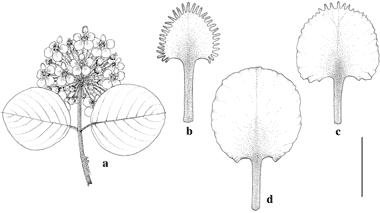H. mortoniana. a. Inflorescence. b. Posterior petal. c. Posterior-lateral petal. d. Anterior-lateral petal.  Scale bar equivalents: a, 4 cm; b–d, 4 mm. Based on Klug 3332, A. Drawn by Karin Douthit. First published in Edinburgh J. Bot. 70: 427. 2013; reproduced with permission of the author.
