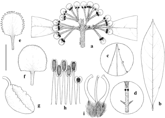 Hiraea occhinonii. a. Node with two inflorescences in each leaf axil. b. Large leaf. c. Detail of leaf apex with marginal glands. d. Base of lamina and petiole bearing a pair of stipules. e. Posterior petal. f. Posterior-lateral petal. g. Anterior-lateral petal. h. Portion of androecium, abaxial view, the stamen at right opposite posterior petal. i. Gynoecium, anterior style in center. Scale bar equivalents: a, 2 cm; b, 4 cm; c, 8 mm; d, 1.3 cm; e–g, 5.7 mm; h, i, 2.7 mm. Based on: a–d, h, i, Occhioni 6363, MICH; e–g, Amorim et al. 3147, MICH. Drawn by Karin Douthit. First published in Edinburgh J. Bot. 71: 368. 2014; reproduced with permission of the author.