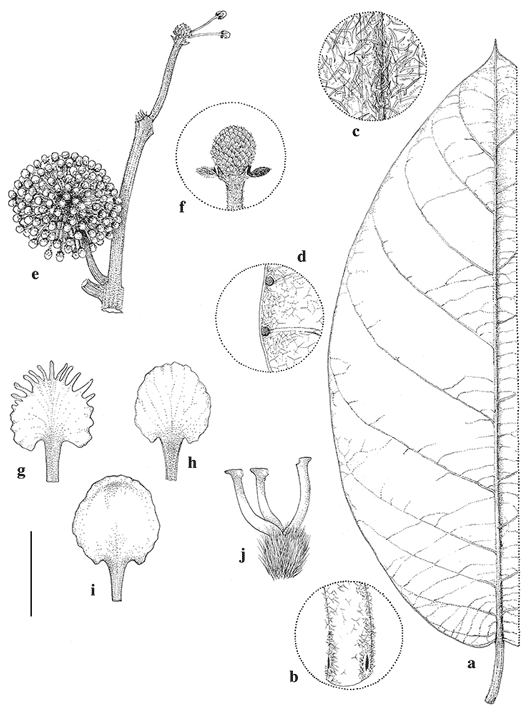 Scale bar equivalents: a, e, 4 cm; b, 1 cm; c, 2 mm; d, g–i, 4 mm; f, 1.3 cm; j, 2.7 mm. Based on von Sneidern 5541, US. Drawn by Karin Douthit. First published in Edinburgh J. Bot. 76 [online] 2019; reproduced with permission of the author.