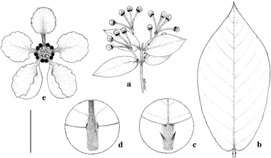 Hiraea restingae. a. Branch with inflorescences in bud. b. Large leaf. c. Base of lamina, adaxial view, and petiole bearing a pair of stipules. d. Base of lamina, abaxial view, with a pair of glands at the insertion of the petiole. e. Flower. Scale bar equivalents: a, b, 4 cm; c, d, 8 mm; e, 1 cm. Based on: a, e, Hoehne 5827, NY; b, Kuhlmann s.n. RB26349, RB; c, d, Anderson 11195, MICH. Drawn by Karin Douthit. First published in Edinburgh J. Bot. 71: 375. 2014; reproduced with permission of the author.
