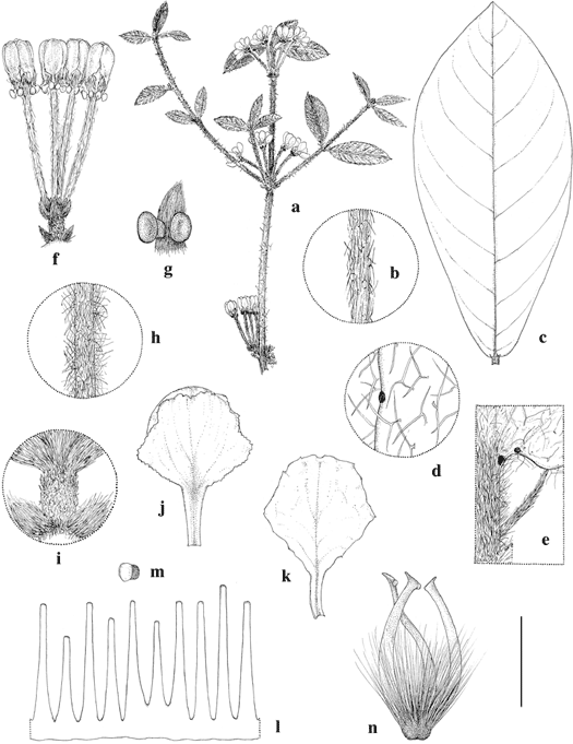 Scale bar equivalents: a, 4 cm; b, 4 mm; c, 4 cm; d, 2 mm; e, 4 mm; f, 1.3 cm; g–k, 4 mm; l–n, 2.7 mm. Based on: a, b, f–n, Martínez 35, MICH; c–e, Wingfield 7826, MICH. Drawn by Karin Douthit. First published in New York Bot. Gard. 108: 216. 2013; reproduced with permission of the author.