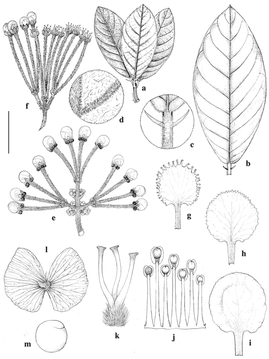 Scale bar equivalents: a, b, 4 cm; c, 8 mm; d, 4 mm; e, f, l, 2 cm; g–i, m, 5.7 mm; j, k, 2.7 mm. Based on: a, García Barriga 11845, NY; b–d García Barriga 11697, NY; e, g–k, Uribe U. 2987, US; f, Schlim 515, P; k, l, Whitefoord & Eddy 486, MO. Drawn by Karin Douthit. First published in Blumea 61: 139. 2016; reproduced with permission of the author.
