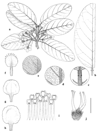 Hiraea trianae. a. Flowering branch. b. Large leaf, adaxial view. c. Base of lamina and apex of petiole with a pair of glands (almost hidden by vesture) and a pair of stipules, adaxial view. d. Detail showing abaxial vesture of mature lamina. e. Detail showing dense adaxial vesture of young lamina. f. Posterior petal. g. Posterior-lateral petal. h. Anterior-lateral petal. i. Androecium, first stamen at left opposite posterior petal. j. Gynoecium, anterior style at left. Scale bar equivalents: a, b, 4 cm; c, 8 mm; d, e, 4 mm; f–h, 6.7 mm; i, j, 2.7 mm. Based on: a–d, f–g, Barclay et al. 3474, US; e, Triana s.n., G. Drawn by Karin Douthit. First published in Blumea 61: 142. 2016; reproduced with permission of the author.