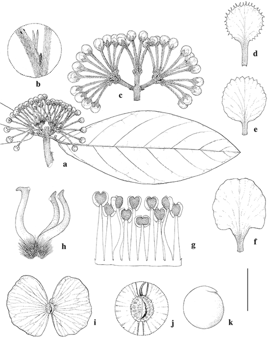 Scale bar equivalents: a, 4 cm; b, j, 8 mm; c, 1.3 cm; d–f, 5.7 mm; g, h, 2.7 mm; i, 2 cm; k, 4 mm. Based on: a, d–h, Benítez de Rojas 2739, MICH; b, Romero 574, MY; c, Saer 473, VEN; i–k, Badillo 1999, MY. Drawn by Karin Douthit. First published in Blumea 61: 144. 2016; reproduced with permission of the author.