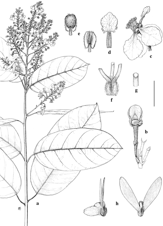 Lophopterys occidentalis. a. Branch with flowers and immature fruits. b. Flower bud and adjacent portion of inflorescence. c. Flower, lateral view, posterior petal uppermost. d. Anthers, abaxial view (left) and adaxial view (right). e. Gynoecium, anterior style to left. f. Apex of style, adaxial view. g. Samaras, lateral view (left) and abaxial view (right). Scale bar equivalents: a, 4 cm; b, 5 mm; c, 6.7 mm; d, 4 mm; e, 1.3 mm; f, 2 mm; g, 1.3 mm; h, 2 cm. Based on Lowrie et al. 293, MICH. Drawn by Karin Douthit. First published in Contr. Univ. Michigan Herb. 23: 97. 2001; reproduced with permission of the authors.