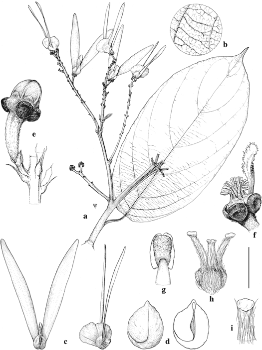 Scale bar equivalents: a, 4 cm; b, 8 mm; c, 2.7 cm; d, 6.7 mm; e, 4 mm; f, 5 mm; g, 1.3 mm; h, 2 mm; i, 1.3 mm. Based on: a–d, Kayap 569, MICH; e–i, Klug 654, NY. First published in Contr. Univ. Michigan Herb. 23: 99. 2001. Drawn by Karin Douthit. Reproduced with permission of the authors.