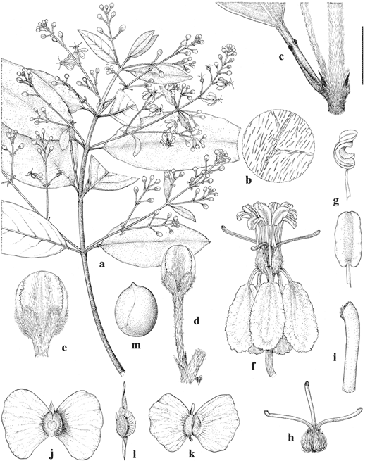 Psychopterys dipholiphylla. a. Flowering branch. b. Enlargement of abaxial surface of lamina. c. Node and base of leaf. d. Flower bud. e. Enlarged flower bud. f. Flower. g. Abaxial view of young anther (below) and twisted old anther (above). h. Gynoecium. i. Distal portion of style and stigma. j. Samara, adaxial view. k. Nut of samara with one lateral wing cut away, side view to show dorsal wing. l. Samara, abaxial view. m. Embryo. Scale bar equivalents: a, 4 cm; b, 2 mm; c, 8 mm; d, 5 mm; e, 3.3 mm; f, 5 mm; g, 2 mm; h, 5 mm; i, 1 mm, j–l, 2 cm; m, 8 mm. Based on: a–i, Anderson 13819, MICH; j, k, m, Hahn s.n., P; l, Hinton 7523, NY. Drawn by Karin Douthit. First published in Contr. Univ. Michigan Herb. 25: 119. 2007; reproduced with permission of the authors.
