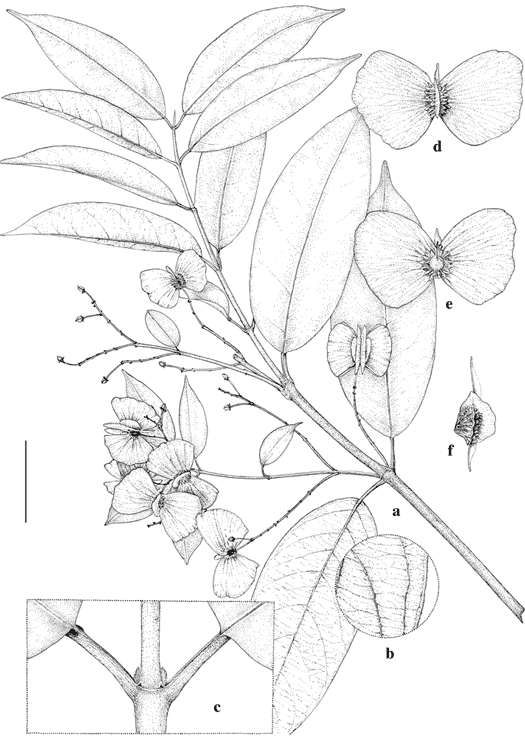 Psychopterys ornata. a. Fruiting branch. b. Enlargement of abaxial surface of lamina. c. Node to show petioles and minute stipules. d. Abaxial view of samara. e. Adaxial view of samara. f. Nut of samara with lateral wing cut away, lateral view to show dorsal wing.