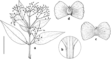Psychopterys psilocarpa. a. Branch with old flowers. b. Apex of petiole to show glands. c. Samara, abaxial view. d. Samara, adaxial view. Scale bar equivalents: a, 4 cm; b, 4 mm; c, d, 1.3 cm. Based on Steyermark 45617, F. Drawn by Karin Douthit. First published in Contr. Univ. Michigan Herb. 25: 131. 2007; reproduced with permission of the authors.